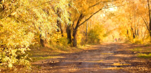 Beautiful colored forest landscape in autumn, with curved dirt road